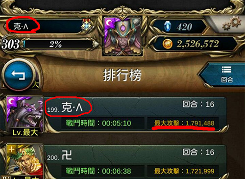 例:該圖片中玩家克的最大攻擊末三碼為 488,只好再繼續打別場。